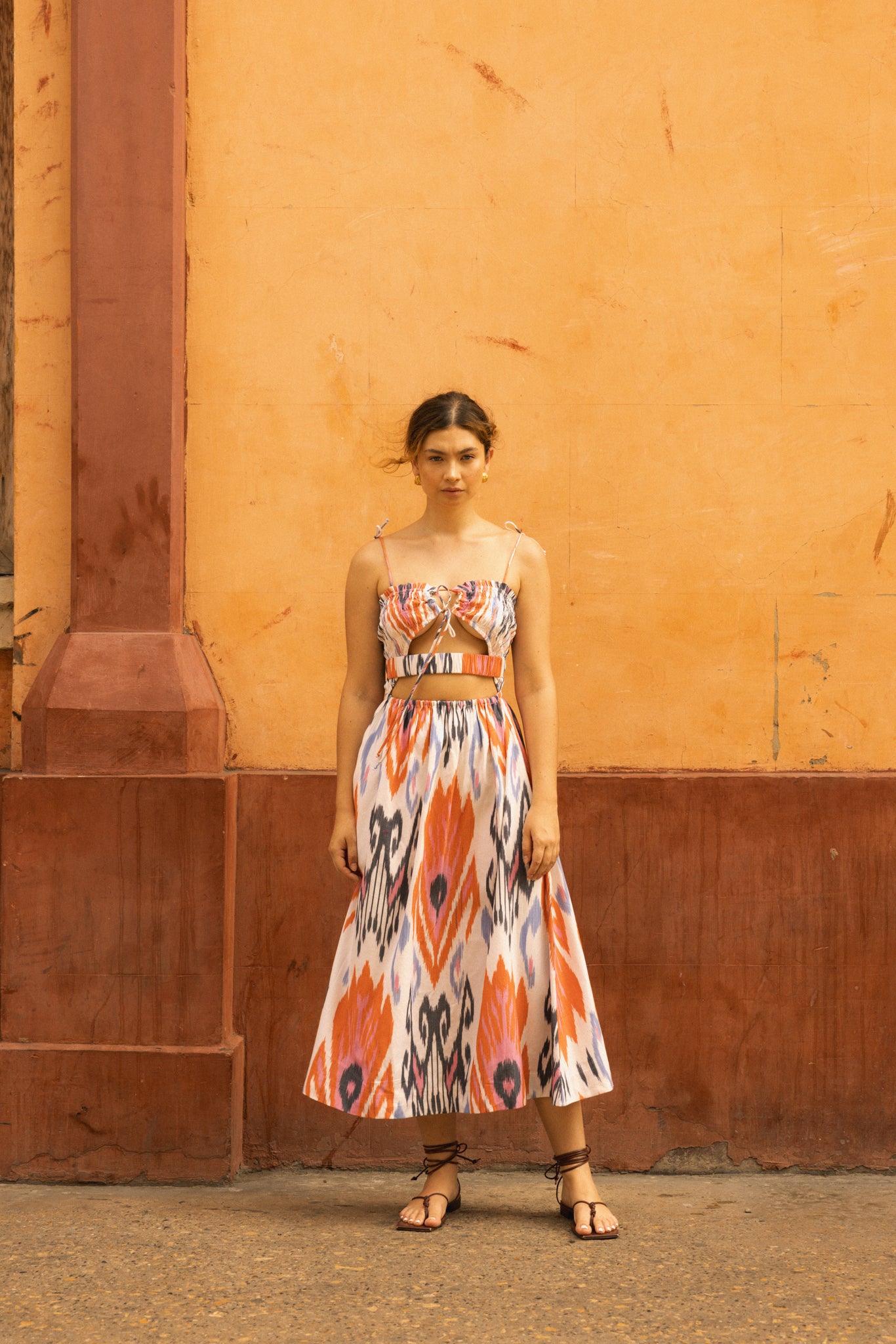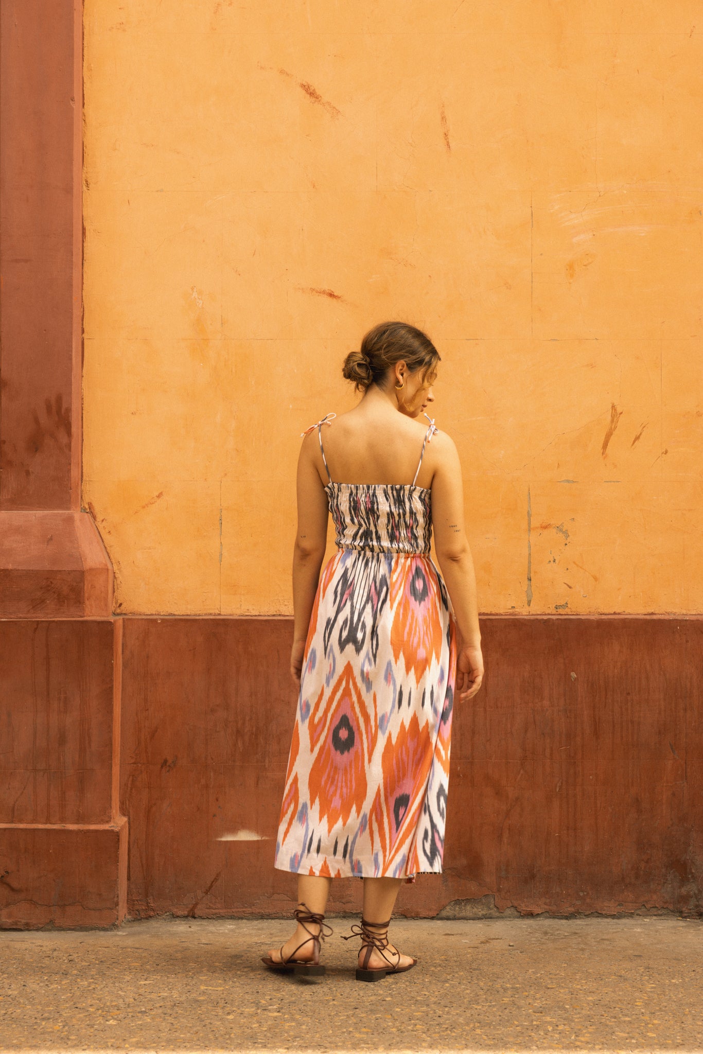 Elevate your wardrobe with this smocked strappy midi dress, crafted from handwoven cotton ikat. Rooted in traditional artistry and reimagined for modern ease, it features a reversible design for styling versatility and a relaxed fit that moves with you from day to evening.